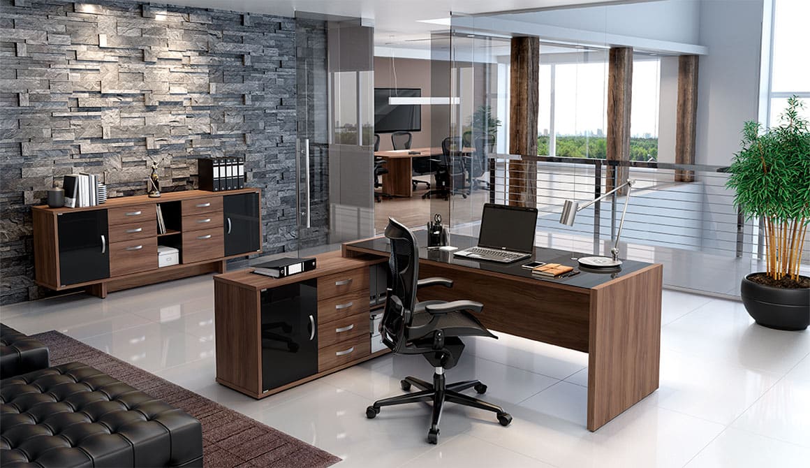 Uma linha contemporânea, sofisticada e prática que mescla cores amadeiradas, lisas, tampos e portas de vidros. Composta por mesa de reunião, mesa reta, mesa com Credenza, armários Credenza, armário Credenza duplo e aparador. Diferencial: mesas com tampos de espessura 25mm com vidro temperado 4mm e saia frontal 15mm, armários com portas de vidro, sistema de fixação minifix, puxadores envernizados e gavetas com trilhos telescópicos.